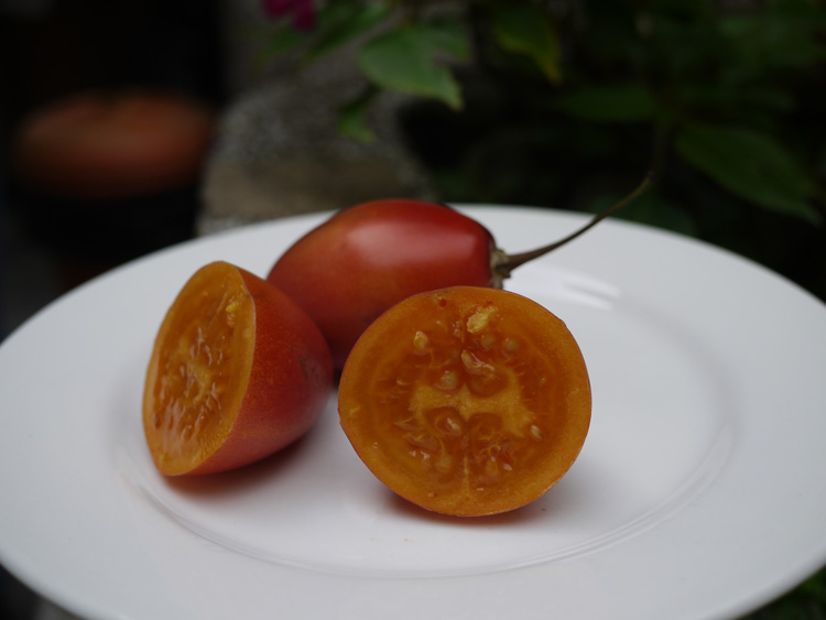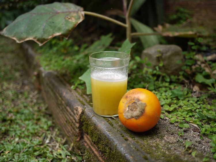Lulo - Smells like old socks, but tastes like heaven! Very acid, this fruit is full of vitamin C. Eduard's mom made juice with it... here it is, taken in her garden with a lulo tree behind it.