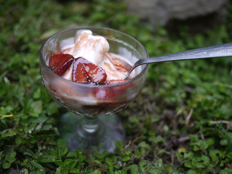 And for desert, he made ice-cream topped with warm balsamic-strawberry coulis. Here is how to do it: