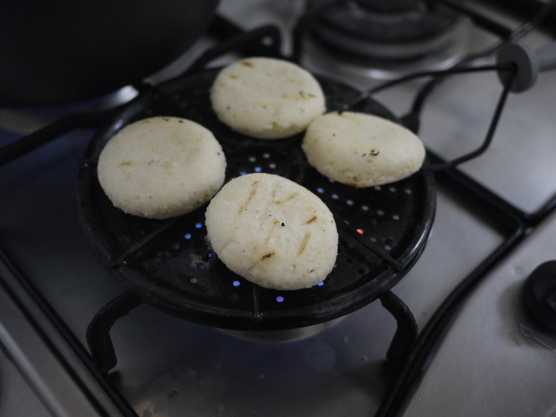 Cooking arepas to go with the tamales – they turned out to be totally unnecessary, the tamales filled us up like hell! Haha