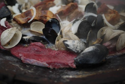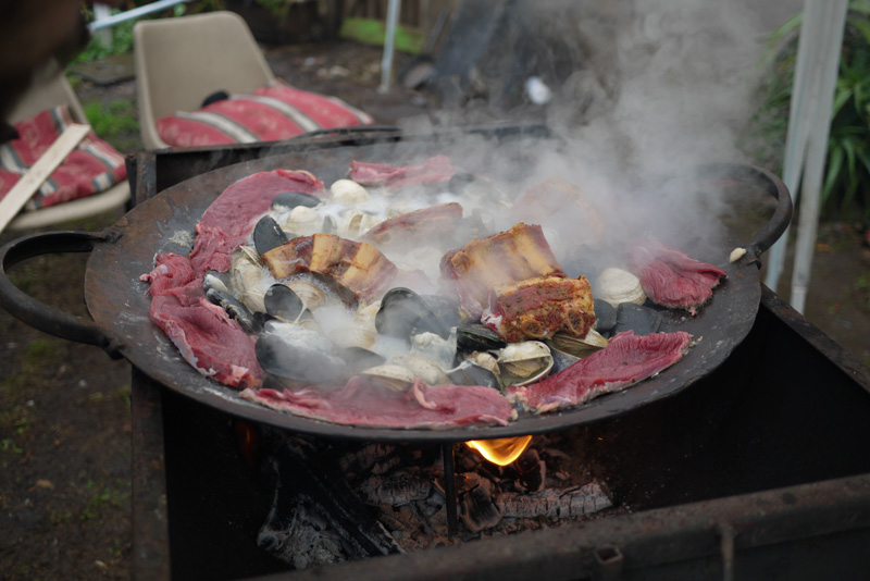 And he then lit up a barbecue, and placed some kind of big cast iron dish on top of it. Then, he placed some chicken in the middle, as well the mussels, meat, ribs and some water: