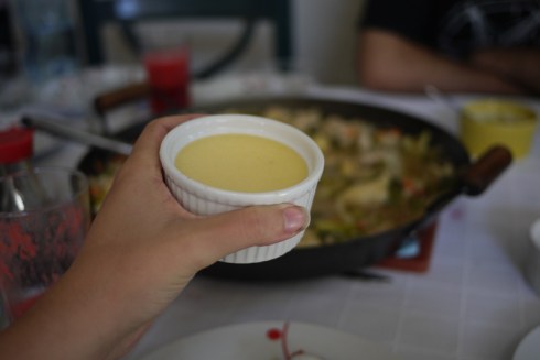 And voilà! It’s ready! He brought the food inside the house, added a bit more white wine, and then served it with some cilantro: