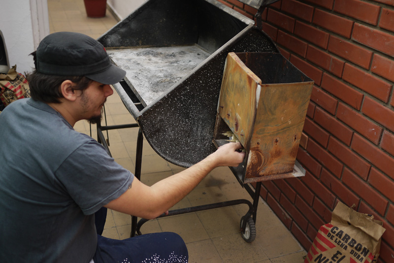 So after, we arrived at Fuser’s house and started preparing the barbecue. Here in Argentina, you start by heating coals in a smaller part located on the side of the barbecue. The coals are then moved to the bigger part using a metallic shovel thing.