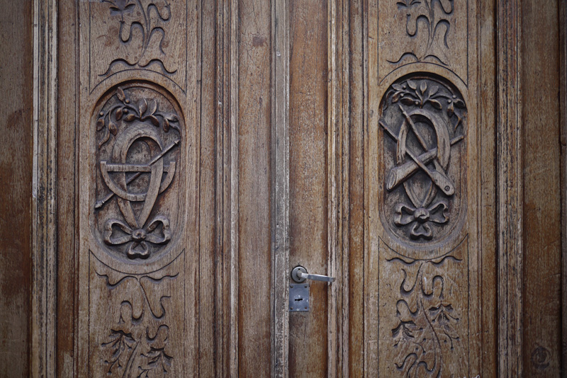 A compass and other Masonic symbols on one of the doors of the San Francisco church