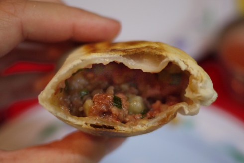 Inside a meat empanada. The trick here is to not cook the meat before putting the empanadas inside the oven, that way they keep all their juices inside the empanadas and stay moist. Perhaps that could be incorporated in our way of doing “tourtières”! They also add some onions, green onions and tiny pieces of potatoes. So good!