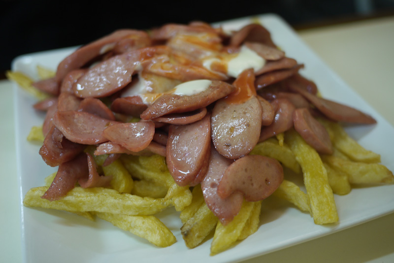 Some shitty Bolivian fast food they call "Salchipapas" (sausagepotatoes). It tasted like reheated Kentucky fries topped with salty baloney.