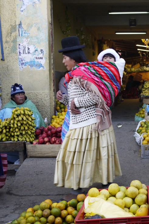 A local Aymara woman carrying its kid in some kind of cloth. Here, everyone has those cloth things - which they use to carry everything.