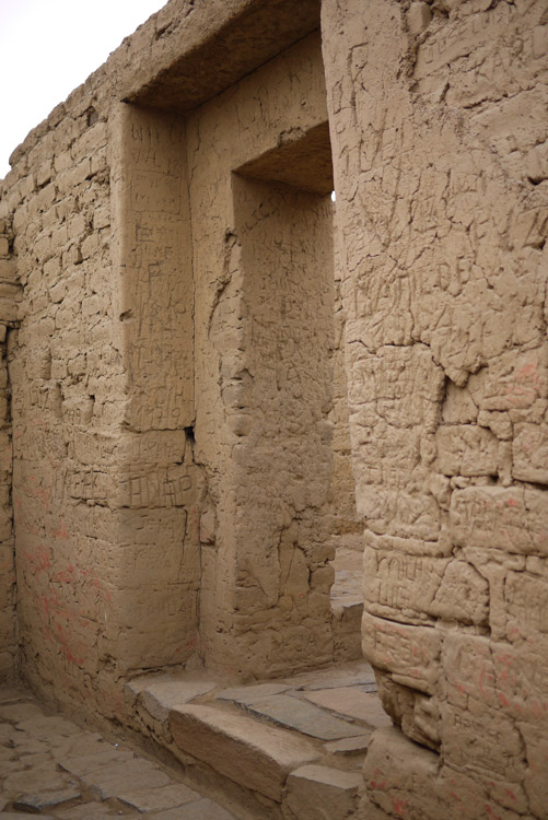 Bricks damaged by name carving. By the way, this is an Inca door, like we saw in Cusco and Machu Picchu! A double frame indicated that the following room was an important one. The Inca took over this temple and built on top of it, but keeping the style of Chimu culture before them.