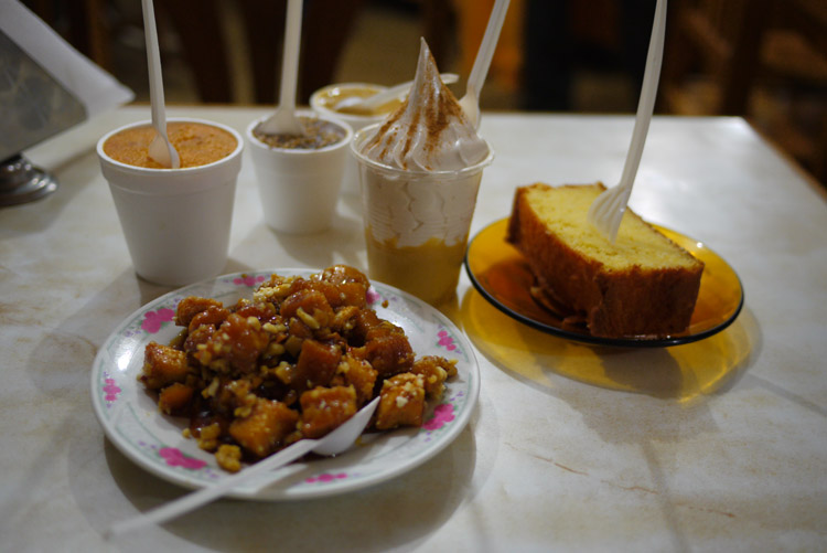 Front: bead crums with mollasses and cheese. Left to right: Bien me sabe (almond and sweet potatoe purée), sweet bean purée (like in the middle of Japanese mochis!), manjar blanco (dulce de leche), suspiro de limena (like sucre à la crème with meringue on top!) and coconut cake.
