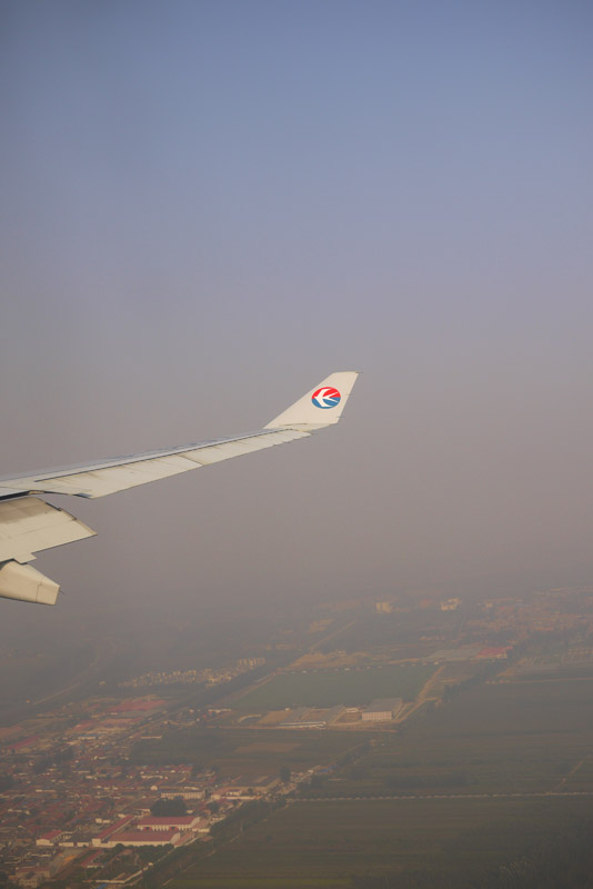 The flight took 3 hours, but we had a guy behind us coughing and then clearing his throat of mucus VERY LOUDLY every 5 minutes. It made me shiver every  time! But I have to get used to it, because it’s a common thing here. I should have recorded it though, it was quite spectacular. Anyway, about 15 minutes before we arrived in Beijing, we looked outside our window, and saw the city… and its immense cloud of pollution. I have read that Beijing was one of the most polluted city in the world, but I had no idea it was going to be that visible! Wow!