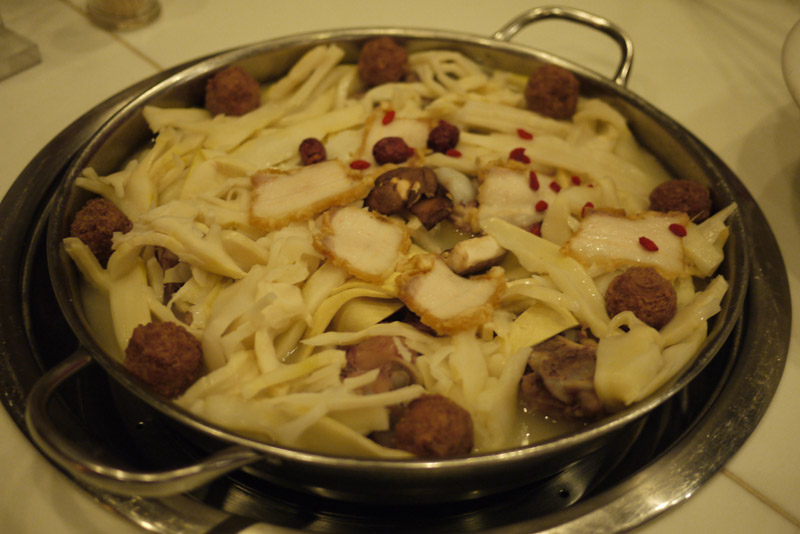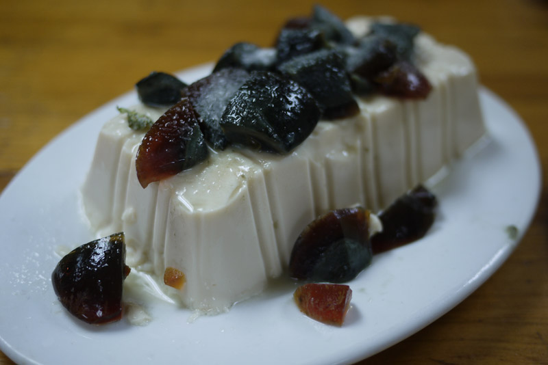 We also tasted a strange curiosity, century eggs! They are preserved eggs that went through a chemical process… the egg white becomes hard cola-coloured gelatine, and the yellow becomes greenish-black. They still tasted like eggs though, which is the weird thing! They were served on very soft tofu, and covered in salt. They have a light ammonia smell… (kind of smelled like pee):