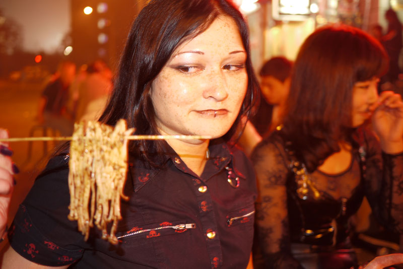 Dawn, an Englishwoman working in China eating a Lovecraftian mushroom skewer
