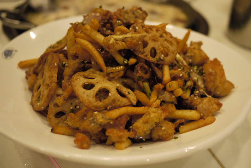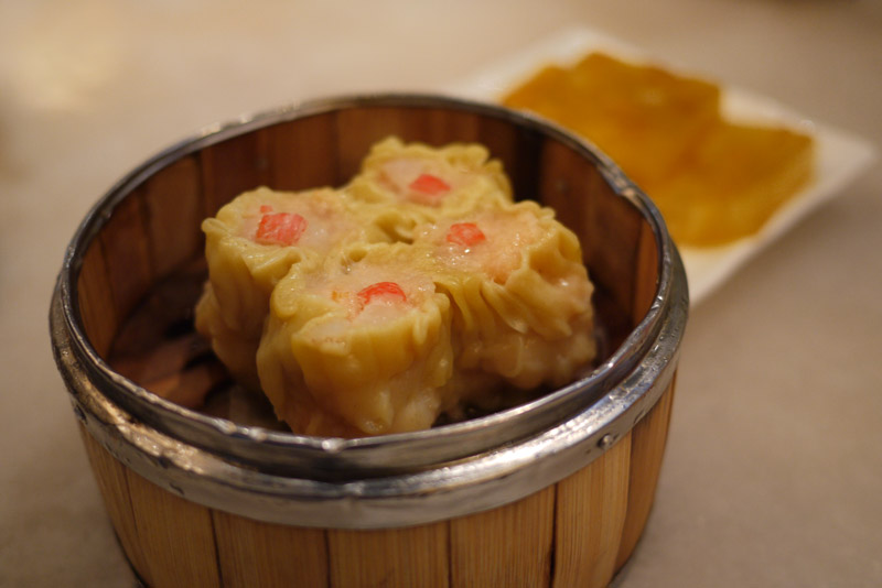 Steamed shrimp dumplings, and at the back, sweet chestnut pancakes (some sort of blend between a French toast and a chestnut pudding!)