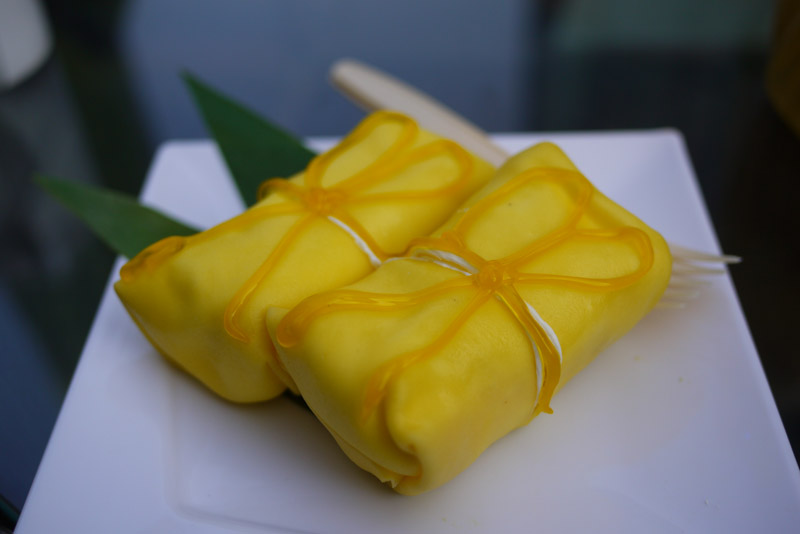Hong Kong style sweet; mango packages! The inside was whipped cream and a real piece of juicy mango. The outside was fondant. Yummy!