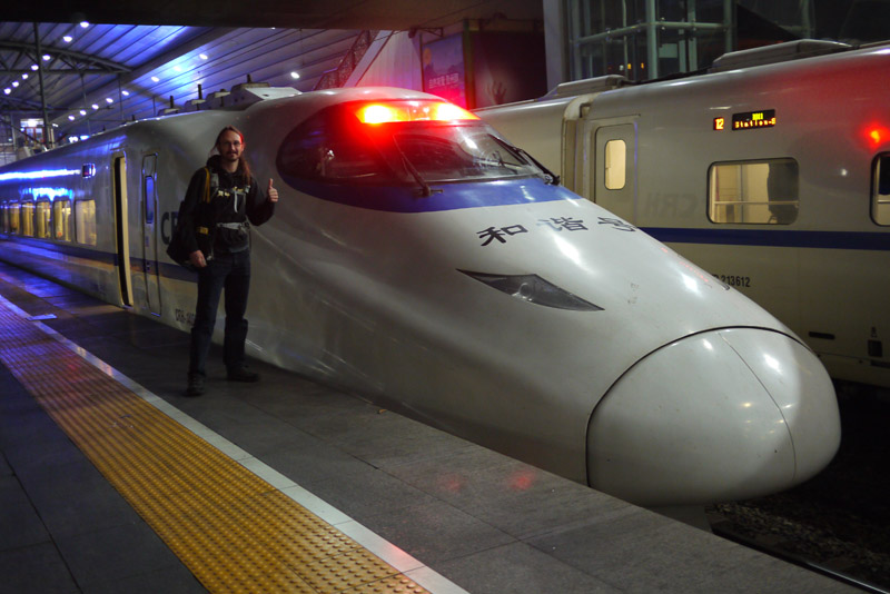 François in front of the train! This is one of the new bullet trains, but as we took it in the night, it only rolled at 150 km/h. We saved 3 hours off the normal 14-hour train ride though!
