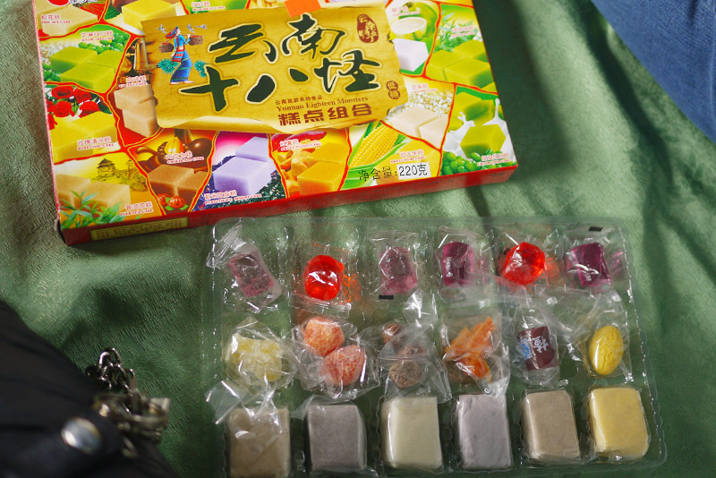 At the train station, I bought some souvenir food from the Yunnan region, which had a funny name. They called the box “Yunnan eighteen monsters”, which perhaps they meant “Yunnan eighteen wonders”. It was not horrific at all, and actually pretty tasty! It was all sweets made with fruits, vegetables, chocolate, sesame and tea.