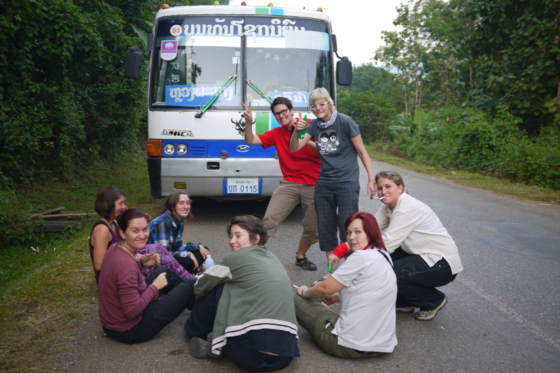 The following day, we had to take the bus AGAIN, to get to Luang Prabang. In fact, we took two different buses; the first one stopped in Udomxai, and went very fast, so we took a second one to Luang Prabang (which was supposed to take 4 hours) Unfortunately, this second bus broke down and we had to wait for a new one on the side of the street, for two or three hours – until night came, really. We were with another group of Czech people, and they had a bottle of Slivovice! (Very strong home-made prune alcohol from the Czech Republic). So I drank with them and we all enjoyed the “forced” break.