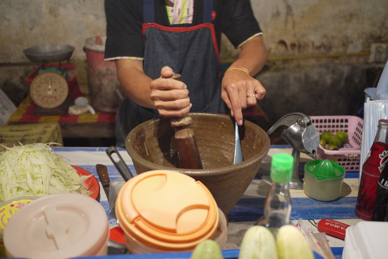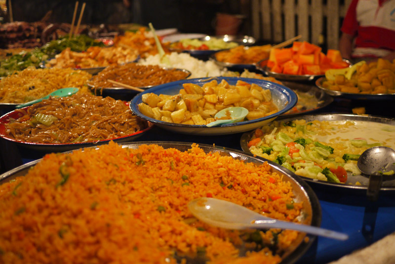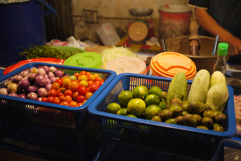 In the evening, we went to visit the famous Night Market – probably the most relaxed market I’ve ever seen. Merchants are either sleeping, or smiling at you! Usually, Asian markets are really stressful!! There was a side street that was dedicated to local cuisine at extremely cheap prices. We found many vegetarian buffets that offered a full plate of food for 1.20$. We ended up eating there four times haha! They also had grilled meats, fish, veggie pastes, sandwiches, fruit shakes and …green papaya salads! That kind of salad was a real discovery for me; it is made with unripe (green) papaya, garlic, cherry tomatoes, olives, raw eggplant, freshly squeezed lime-juice, fermented crab sauce, fish sauce, chillies, salt and peanuts. I had some twice. Apparently, you can find that in Thailand too…!!
