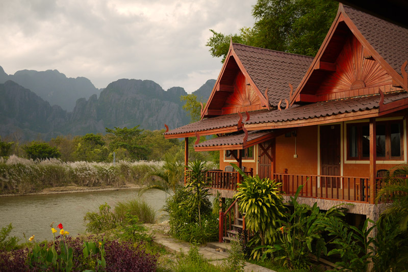 I had read a few years ago about this place, but totally forgot about it. The “cool” thing to do here is rent a tube and float down the river, while getting loaded in river-side bars on plastic buckets filled with booze – or take some “magic/happy shakes”, drinks made with weed, magic mushrooms or even opium! On top of that, these bars often have sketchy slides or tires which you can use to jump in the water… all of those things together make a lethal mix, and turned Vang Vieng into SE Asia’s most dangerous backpacker destination! To be honest, I was only interested in the scenery, so we relaxed and drank beer beside the river and mountains. The rest of the village is a tourist ghetto nightmare… it’s filled with restaurants playing either “Friends” or “Family Guy”, karaoke bars and gift shops, and the city is populated by drunken frat boys and girls… so you understand why I stayed at my beautiful spot: