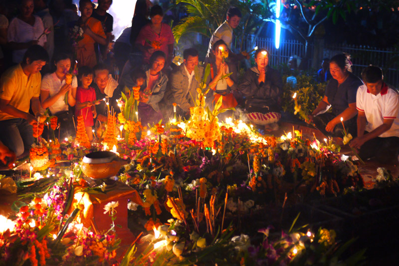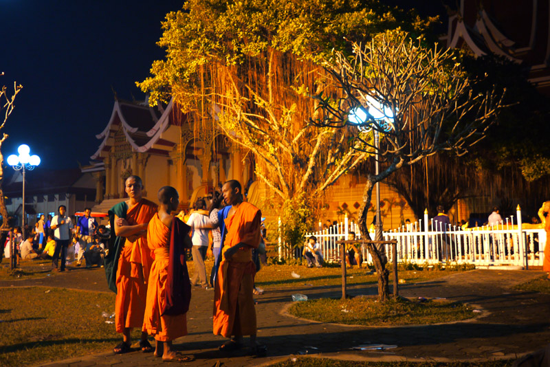 The festival usually lasts three days, starting with a wax castle procession and ending with a procession around the stupa. We only saw the last day celebration – which was quite enough… there were thousands of monks and perhaps 100 000 pilgrams (or more!!) that came from all over the country to celebrate. The people offered banana leaves covered with flowers, bouquets of flowers with candles, incense, etc… and at the end, the monks blew fireworks – symbolizing an offering of flowers of light to Buddha. There was also music, street food sellers, and all sorts of merchants everywhere…