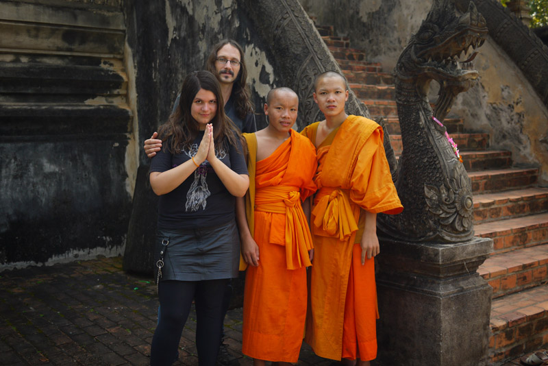François, myself and two young Buddhist monks... notice the totally kickass "Naga" staircase on the right