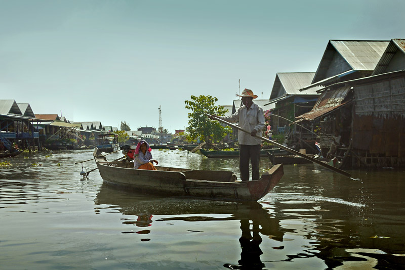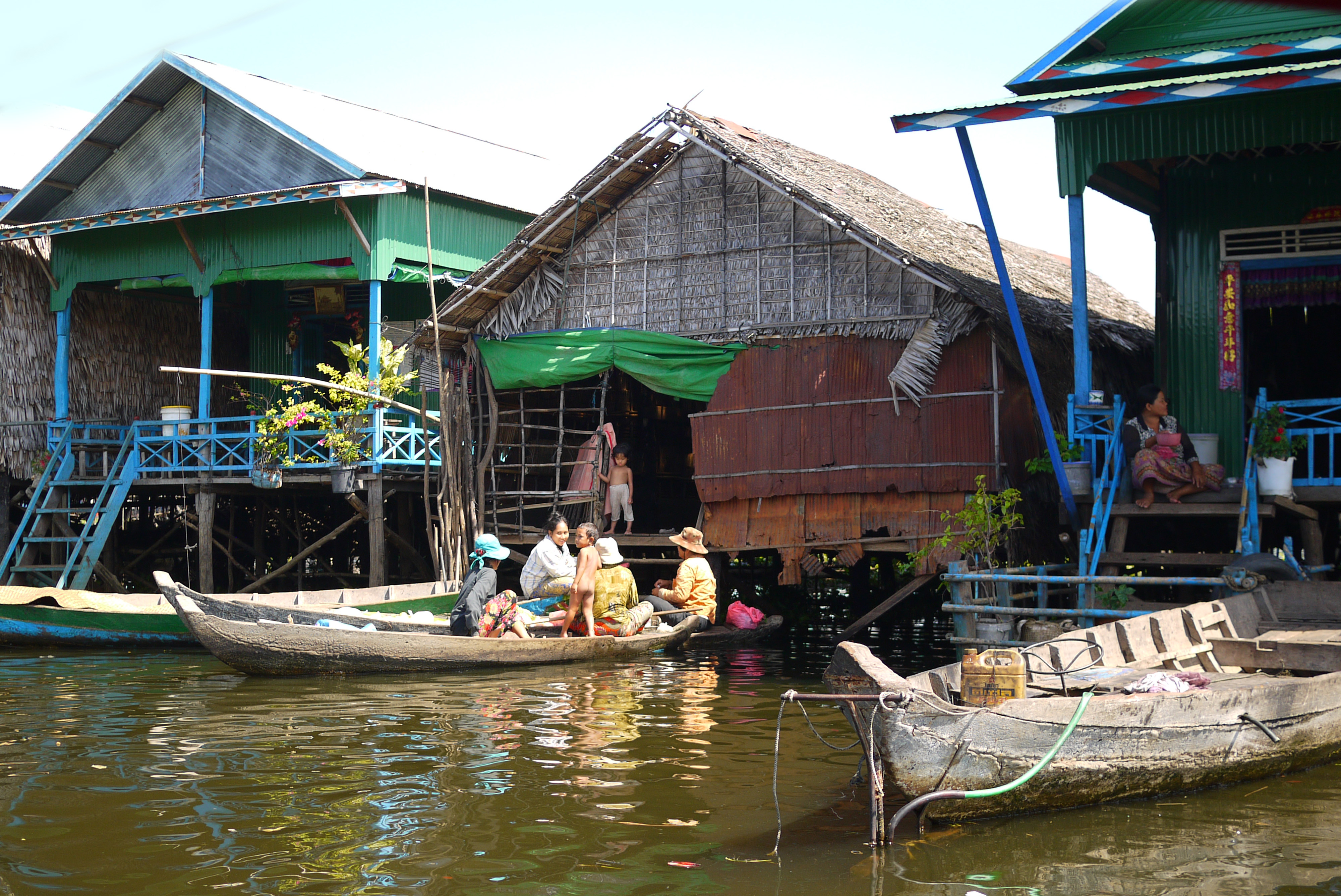 Beside the temples, we also visited something totally unusual; Kompong Phluk – a century-old Khmer village located in a flooded forest. In fact, the houses are built on 6-meter high support piers, on top of the Tonle Sap Lake – who’s water level changes every season. For most of the year, the lake is fairly small (one meter deep/2,700 square km wide). During the rainy season, however, water is pushed up into the lake, increasing its area to nine meters deep/16,000 square km wide, flooding nearby fields and forests. Right now, the water level was still very high, so you barely saw the mangrove forest, and there was less than a meter left before the water reached the houses! It looked really cool, almost like the entire village was floating! And you ask, why go through so much trouble building a village that gets flooded every year? The Tonle Sap lake is the largest freshwater lake in South East Asia, and provides 75% of Cambodia’s annual inland fish/seafood catch. Building your village right in the middle of it makes fishing much easier! But soon, the waters will go back to normal. Kompong Phluk will see the ground and its residents will have to climb ladders six meters high to enter their homes (!!)… for now, everyone is enjoying the water; especially children (who are butt naked half the time!!)…