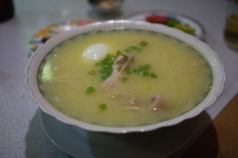 The soup, still heavily boiling at our table. There was a whole chicken in there, which was stuffed with rice!