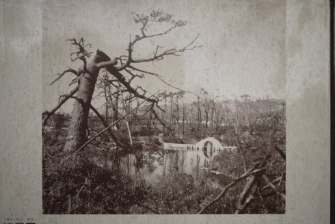 The garden after the atomic bomb. Notice how only the concrete bridge is still standing up! It was at 650m from the hypocentre.